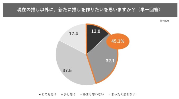 現在の推し以外に、新たに推しを作りたいと思う人が「とても思う」「少し思う」を合わせると45.1%。推しを一人に絞ることなく、複数人・多ジャンルに渡って推しを増やしていきたい人が一定数いることがわかりました【画像⑬】。