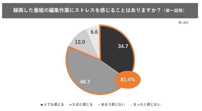 また、録画した番組の編集作業にストレスを感じる人は「とても感じる」「たまに感じる」を合わせると81.4%となり、編集作業をする人のほとんどがストレスを感じていることが明らかとなりました【画像⑫】。