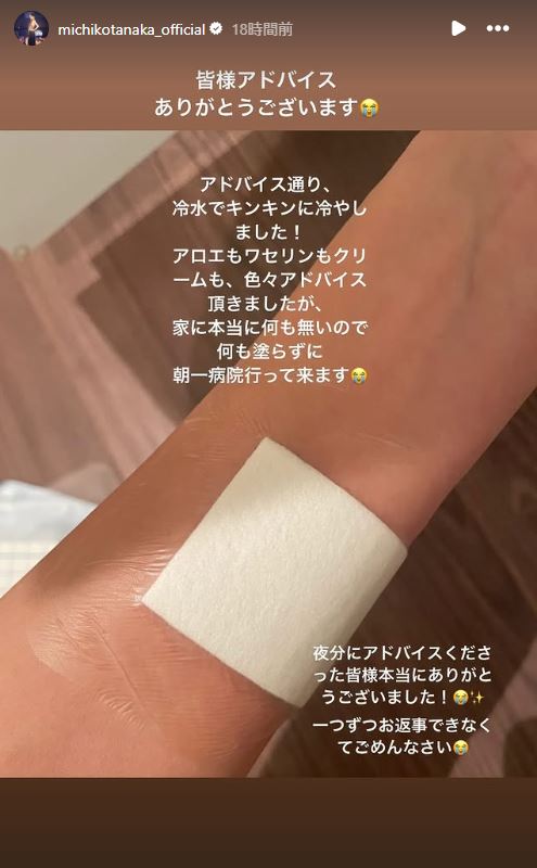 続く投稿では、患部に白い湿布らしきものを貼った写真を投稿。「アドバイス通り、冷水でキンキンに冷やしました!」と知らせています。薬剤などが家に無いとのことで「何も塗らずに朝一病院行ってきます」と告げつつ、アドバイスをくれたフォロワーたちに感謝の言葉を綴っています。