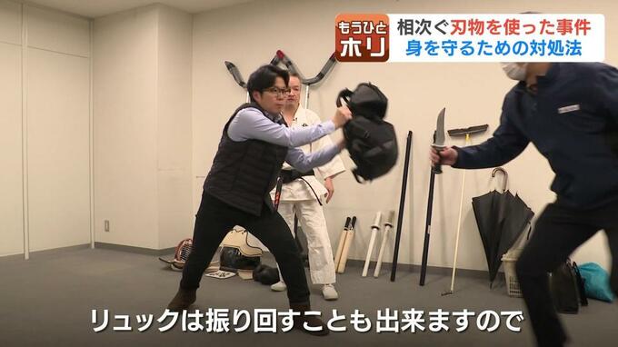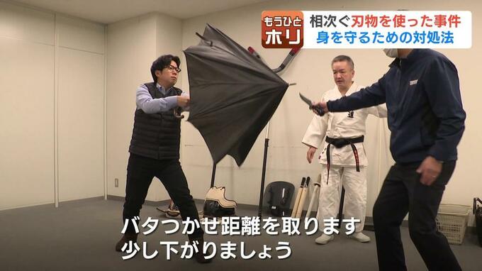 「ただ横に振り回しても効果がないので、バツを描くような形で。ナイフを落とすといっても、刃先から肘を狙って」