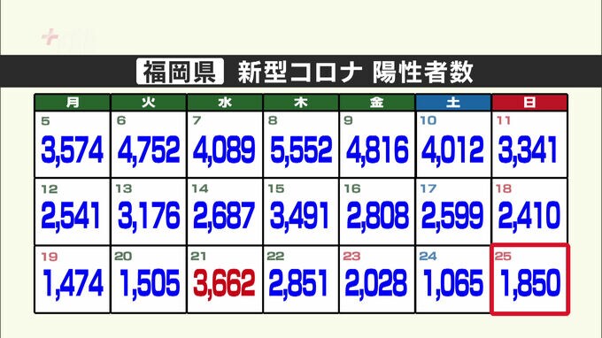 新型コロナウイルスについて福岡県では25日新たに1850人の陽性が確認されました。福岡県の一日ごとの陽性者数を示すカレンダーです。25日は1850人で、2日連続で2000人を下回りました。発表自…