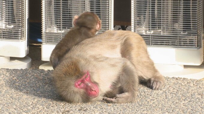 毎年恒例の暖かい贈り物にエサ場に集まったサルはヒーターの前で暖を取っていました。
