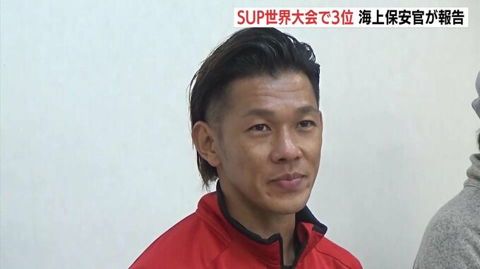 ことしアメリカで開かれたSUP=スタンドアップパドルボードの世界大会で3位になった海上保安官が、関係者に結果を報告しました。