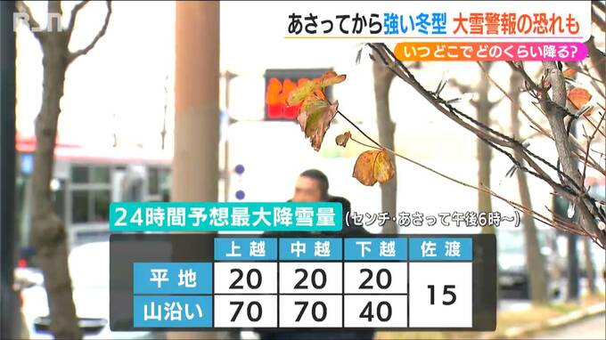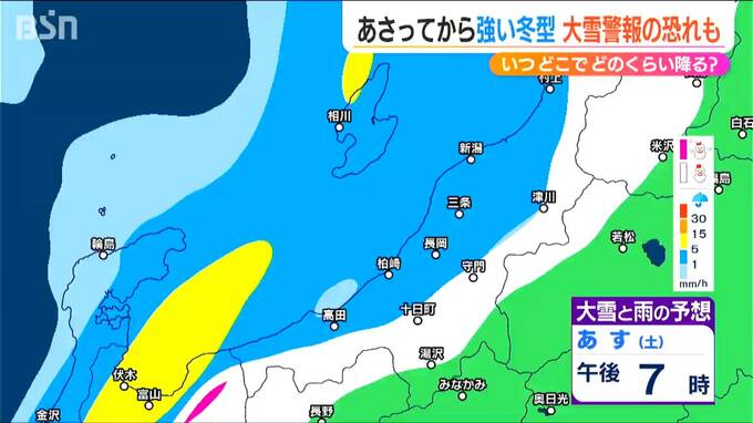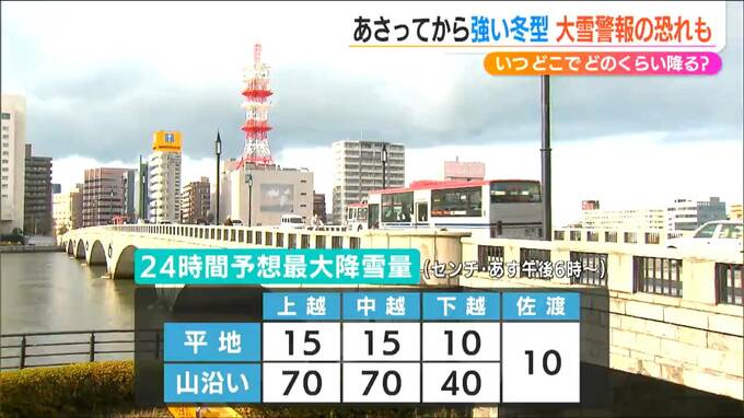 21日の夕方からの22日夕方までに降る雪の量はいずれも多いところで上・中越の山沿いで70センチと、上・中越の平地で15センチ、