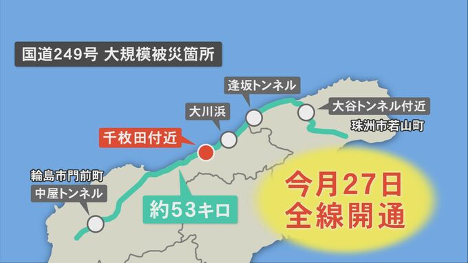奥能登の大動脈、国道249号は27日に輪島市門前町と珠洲市若山町を結ぶおよそ53キロの全線で通行が再開されます。