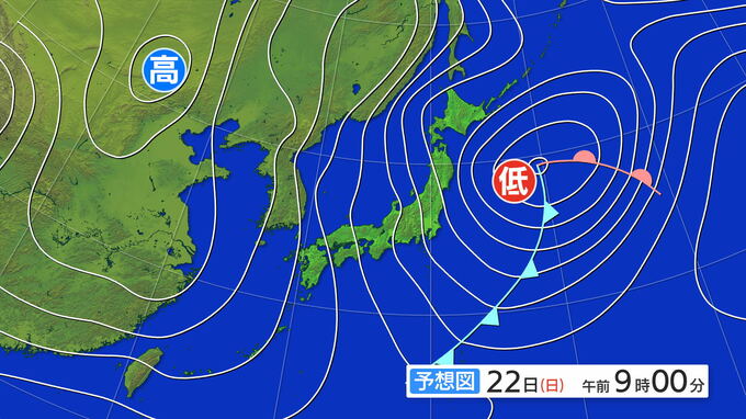 冬型の気圧配置が強まる見込みです。等圧線の間隔が小さく風も強まりそうです。