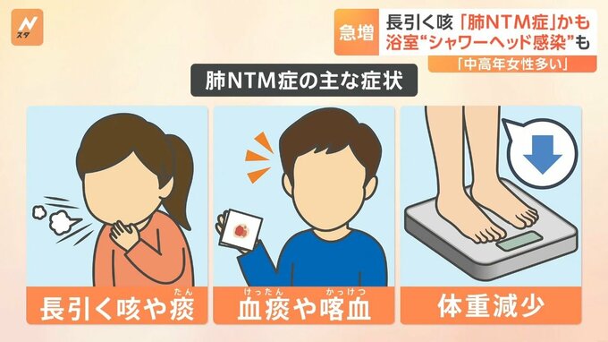 「非結核性抗酸菌」=NTMという菌に感染することで発症する「肺NTM症」。長引く咳や血痰、体重が減るなど、その症状は結核に似ているといいます。さらに…