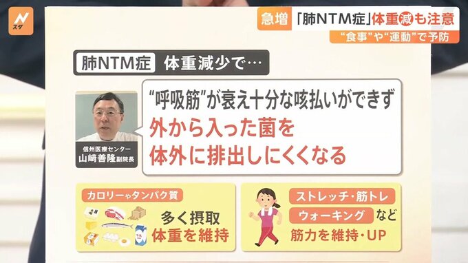 体重減少という症状もあり、信州医療センターの山﨑善隆副院長によると、「“呼吸筋”が衰え、十分な咳払いができず、外から入った菌を体外に排出しにくくなる」ということです。