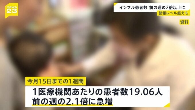 季節性インフルエンザの患者数が8週連続で増加しました。全国およそ5000の医療機関から今月15日までの1週間に報告された患者数は1医療機関あたり「19.06人」。前の週の2.1倍に急増しています。都道府県別で最も多…
