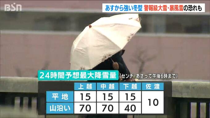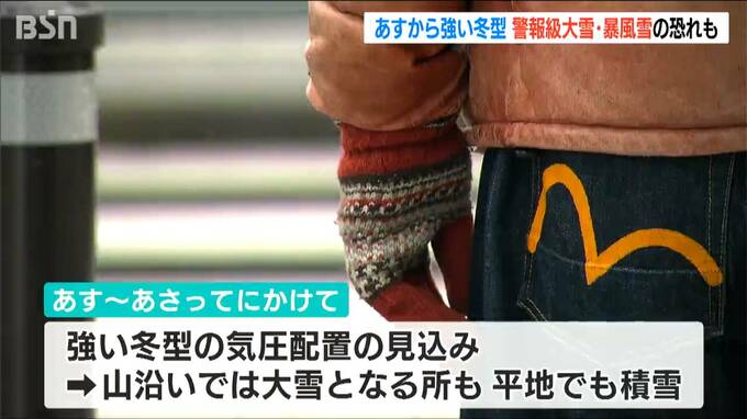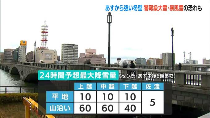 新潟県内は22日から強い冬型の気圧配置となり平地でも積雪となる見込みです。警報級の大雪や暴風雪などの恐れもあります。