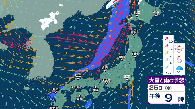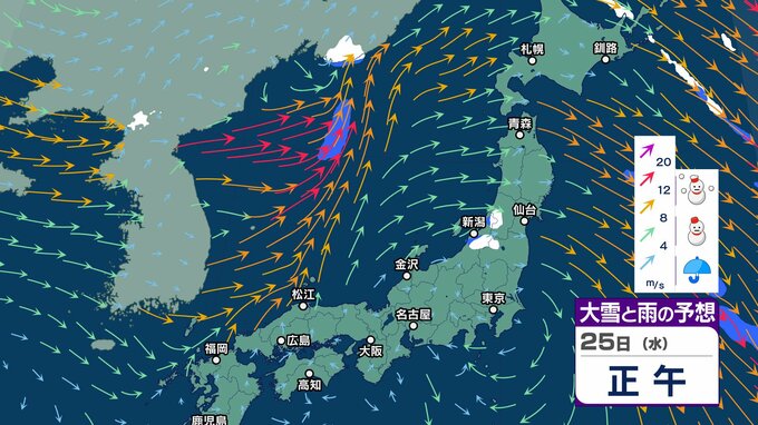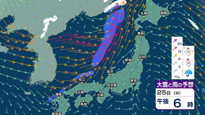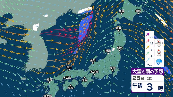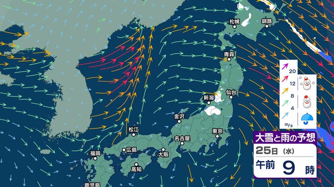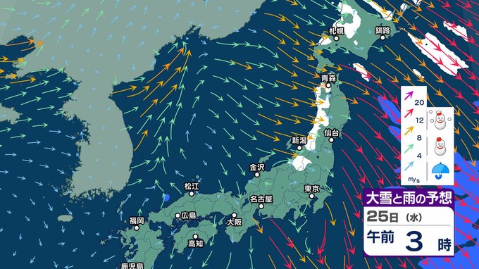 嵐の使者…“強烈寒気” 南下で本州すっぽり 23日にかけ強い冬型の気圧配置【 雪と雨の動き 3時間ごとシミュレーション】日本海側は高波にも警戒 週明けからホワイトクリスマスか チューリップテレビ 2024年12月22日(日) 00:48 国内 天気 雪と雨のシミュレーション 25日(水)