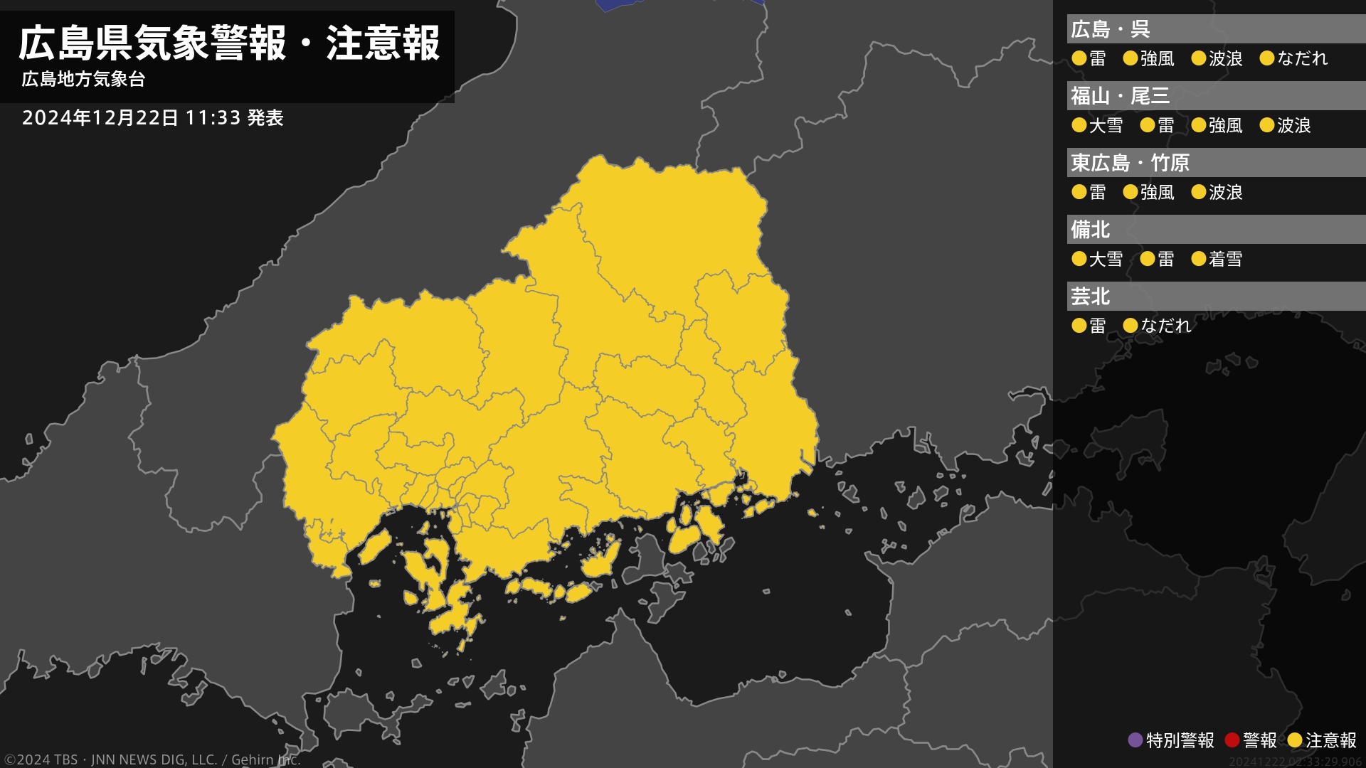 南部では、強風や高波に注意してください。広島県では、大雪や落雷、なだれに注意してください。北部では、電線等への着雪に注意してください。