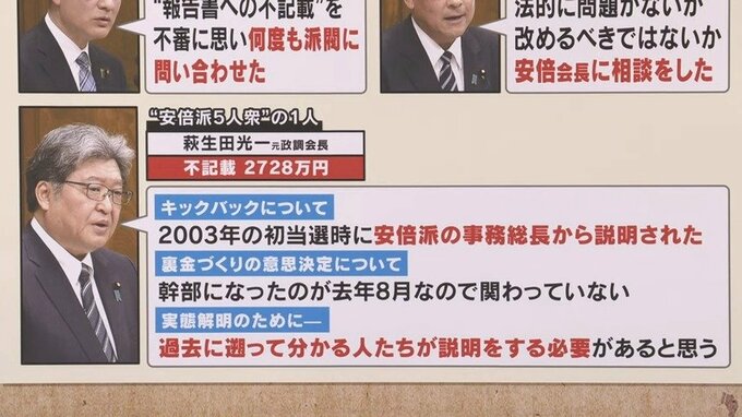 キックバックのシステムについては、「2003年の初当選のときに安倍派の事務総長から説明された」と明かしましたが、一連の裏金作りをめぐる意思決定については、「幹部になったのが2023年8月なので関わっていない。実態解明のためには、過去に遡ってわかる人たちが説明する必要がある」などと話しています。