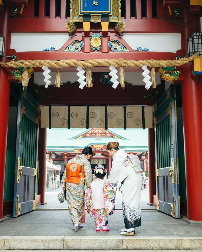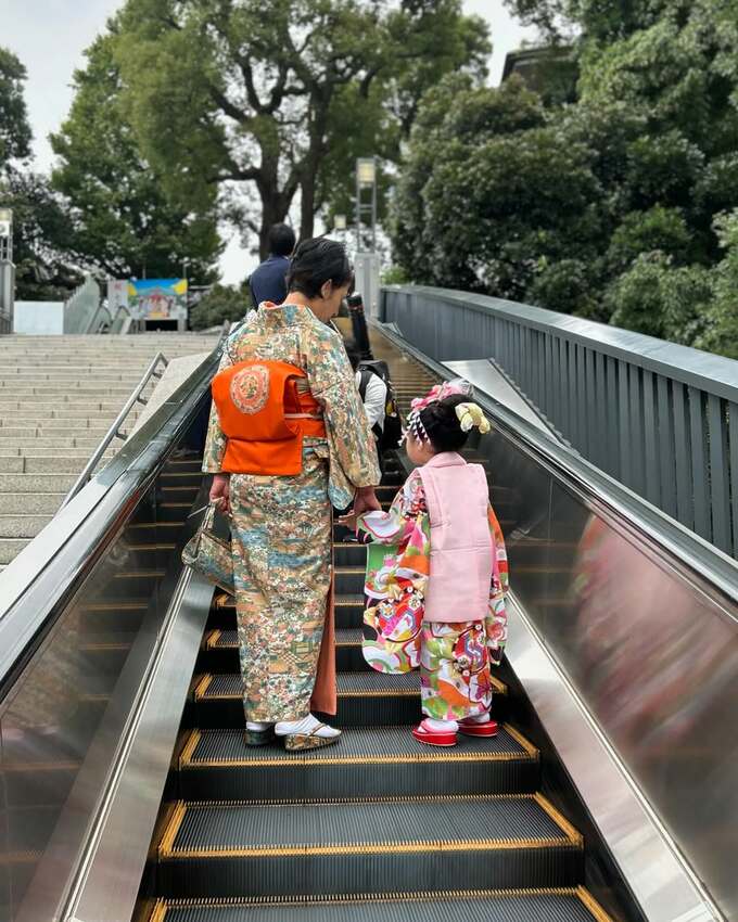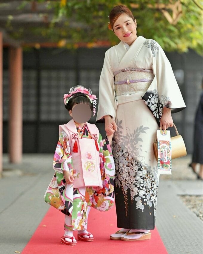 「母が悪目立ちしないよう...笑 モノトーンの辻が花模様、草花のシルエットで大人の品を漂わせてみました。今回着物はレンタルしたのですが、重ね襟と言うものがなく、当日急遽家にあったピンクのリボンスカーフを代用し差し色かましてみました」と工夫したことも記し、「神社では淡いピンクや水色の着物の方が多かったので、結果神社で誰とも被らず母と3人のバランスも絶妙に良かったかもです」と報告するとともに、ノラさんのお母さん、ノラさん、長女の3人で開運碁盤に乗っている写真や、境内に入る3人の後姿の写真を投稿しました。
