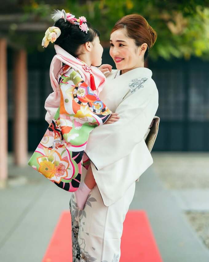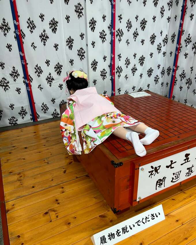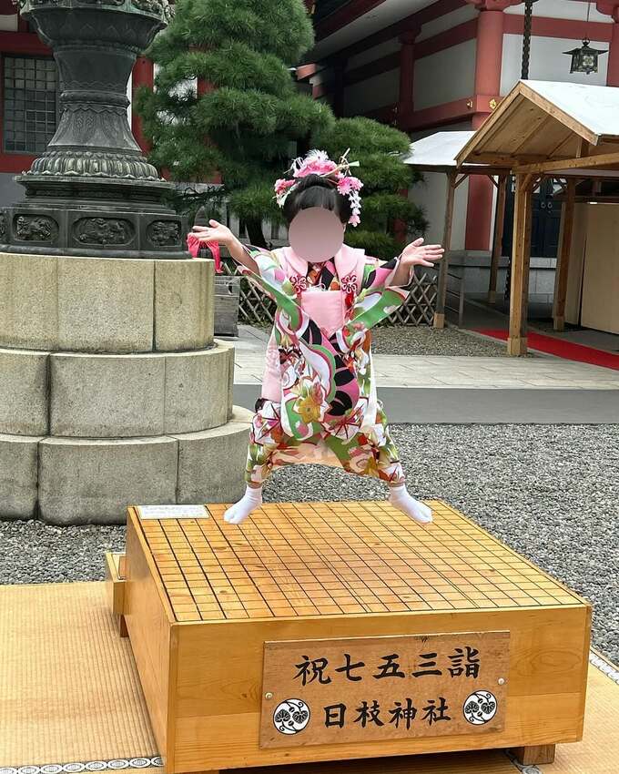 愛娘の着物について、「バブ子の着物は③でした」と発表し、「コメントも1番人気でした!鮮やかなピンクと緑地に大きな椿と紅葉柄が子どもらしくて可憐で可愛かったです。あんみつ姫のような、ザ日本髪の盛り盛り飾りをしたかったので、インパクトに負けない着物でヘアとのバランスも良かった!3歳ならではの着られてる感がキュンでした」と心境を報告。日枝神社の境内に設置された、2種類の開運碁盤に乗ったり、寝そべったりしている長女の写真を投稿。