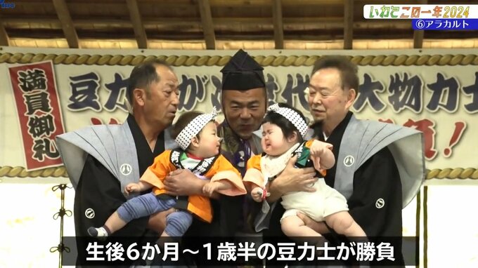 生後6か月から1歳半までの豆力士たちが、泣いたら負けの大一番に臨みました。