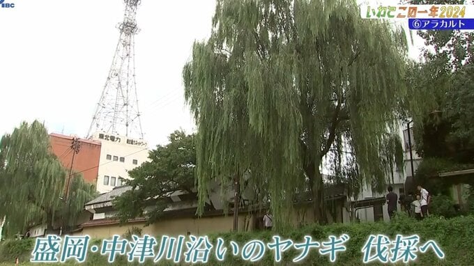 盛岡市の中津川沿いにある3本のヤナギの木は、成長により市の景観重要建造物であるござ九の塀や建物を損傷しているとして伐採が決まりました。
