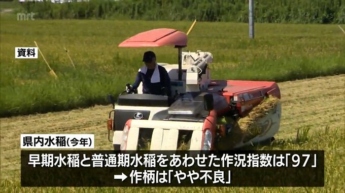 宮崎県内産の水稲の今年の作柄が発表され、早期水稲と普通期水稲をあわせた作況指数は「やや不良」でした。九州農政局によりますと、県産水稲の作付面積は1万4500ヘクタールで、前の年に比べ200ヘクタール減少。収…