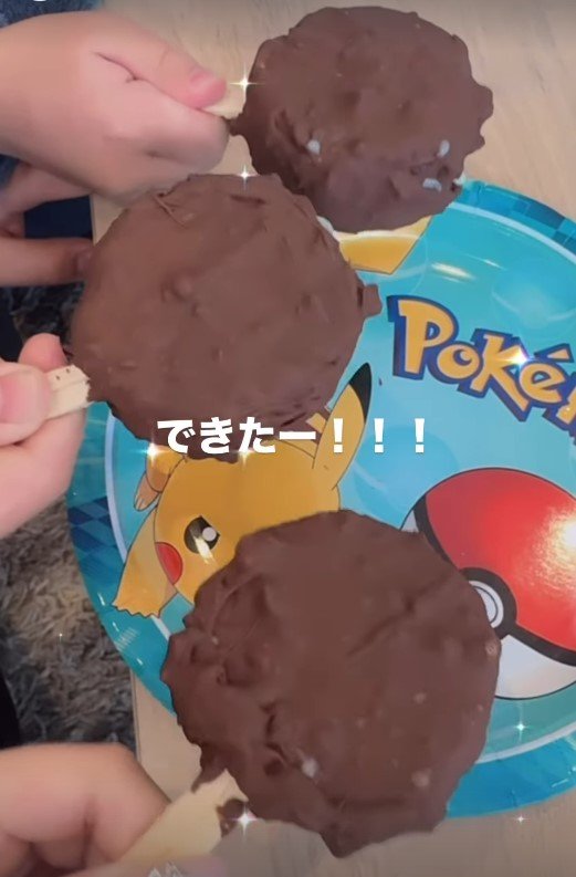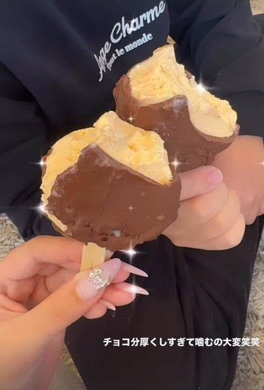 続けて、「できたー!」と、チョコレートでコーティングした棒アイスの完成品を披露し、「チョコ分厚くしすぎて噛むの大変笑笑」と、かじった後と思われるアイスの動画を載せました。