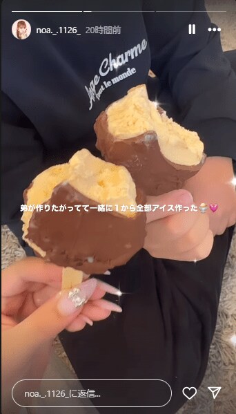 希空さんは、インスタグラムのストーリーズに「弟が一緒に作りたがってて一緒に1から全部アイス作った」と、チョコレートがコーティングされた棒アイスの動画に文字を載せて投稿しました。