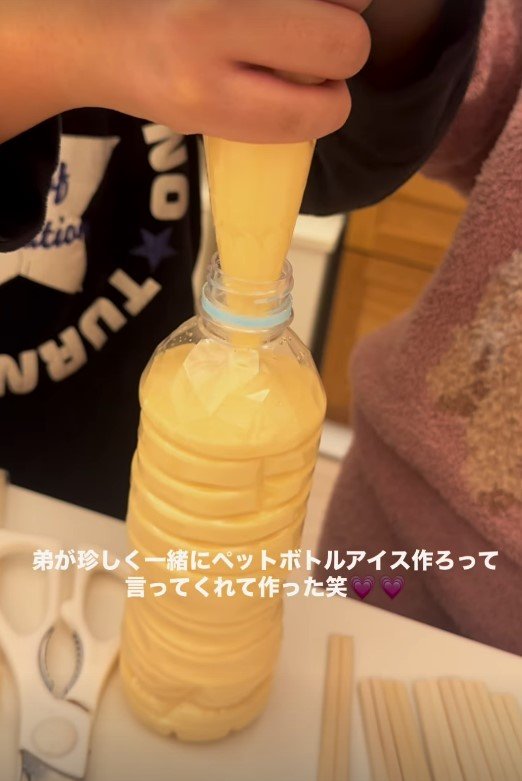 詳細については、希空さんのお菓子やパン作り専用アカウントのストーリーズでアップし、「弟が珍しく一緒にペットボトルアイス作ろって言ってくれて作った笑」と書き込み、弟と思われる手で、空いたペットボトルにアイスを流し込む動画を掲載。
