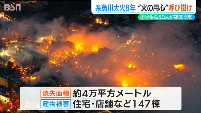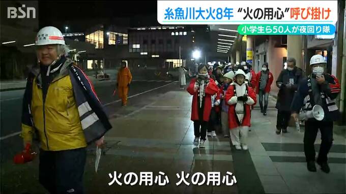 被害が大きかった糸魚川市大町では小学生や住民およそ50人の「夜回り隊」が法被姿で町を歩き「火の用心」を呼びかけました。