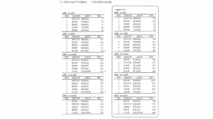 「箱根温泉」は若年層に、「草津温泉」は60代以降の人気が高いようです。40代と50代で人気トップが「草津温泉」から「箱根温泉」に入れ替わり、30代での「黒川温泉」と40代・50代での「別府温泉郷」は新たにランクインしました【画像⑧】。