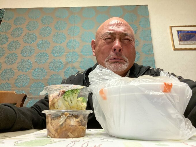 自宅のテーブルには、袋に入れられたままのコンビニで買ったおでんと、元アスリートらしくバランスを考えたブロッコリーが入ったサラダに、キノコが調理されたお惣菜が並べられています。