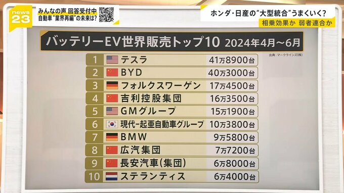 自動車専門の調査会社「マークラインズ」が世界のEVの販売台数をまとめたものです。1位がアメリカのテスラ、2位に中国のBYDと海外勢が続いていますが、トップ10を見てみると日本のメーカーが入っていないというのが実情です。この差をどう挽回すれば良いですか。