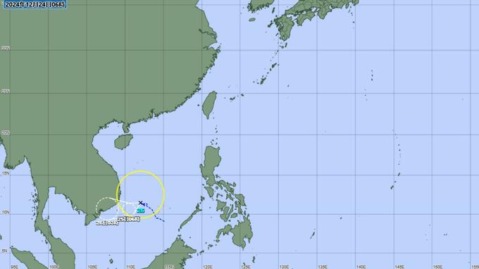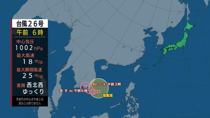 台風26号(パブーク)は24日午前6時には南シナ海にあって、ゆっくりと西北西へ進んでいます。中心付近の最大風速は18メートル、最大瞬間風速は25メートルです。今後もゆっくり西へ進み、26日には熱帯低気圧に変わる予想です。