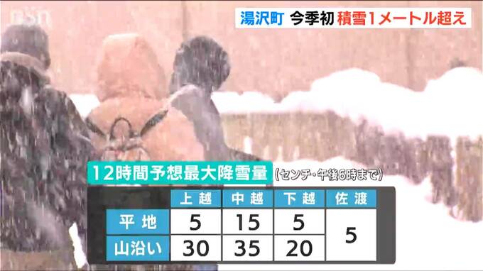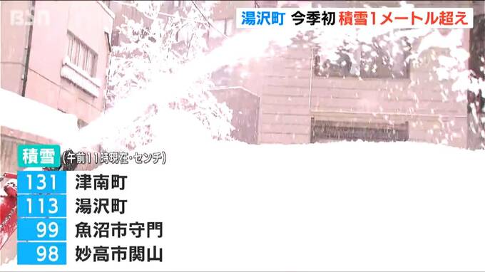 各地の積雪は津南町で1メートル31センチ、湯沢町で1メートル13センチ、魚沼市 守門で99センチなどで、今シーズン初めての積雪1メートル超えとなっています。
