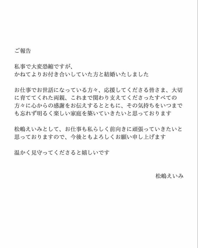 松嶋さんは、「今後とも松嶋えいみとして、お仕事も私らしく前向きに頑張っていきたいと思っておりますので、今後ともよろしくお願い申し上げます」と、今後について伝え、「温かく見守ってくださると嬉しいです」と綴りました。