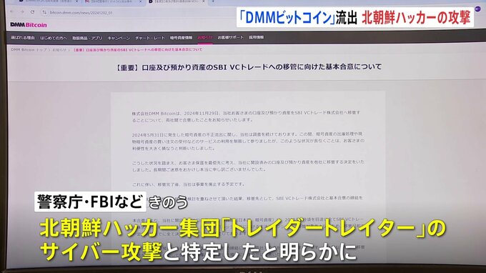 暗号資産交換会社「DMMビットコイン」からおよそ482億円相当が流出した事件で、警察庁などは、北朝鮮のハッカー集団「トレイダートレイター」によるサイバー攻撃と特定したと公表しました。DMMビットコインは、今年…