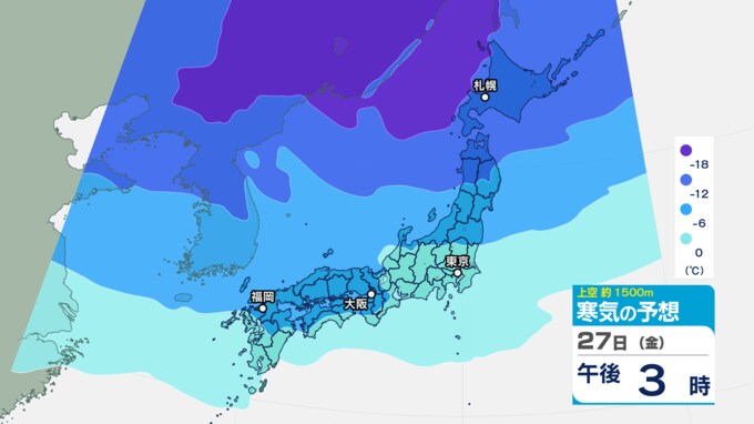 27日(金)から28日(土)は、冬型の気圧配置が強まります。東日本から西日本の上空1500メートル付近には、氷点下6℃以下の強い寒気が覆う予想で、日本海側を中心に警報級の大雪の恐れがあります。全国的に年末は厳しい寒さになりそうです。年末は、北海道、東北、北陸は降雪量が多くなり、関東甲信や九州でも一部で雪となりそうです。