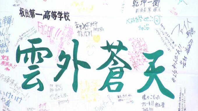 壮行会には、花園初の1勝を目指す、ラグビー部を応援しようと生徒ら約300人が集まりました。ダンス部の演舞のあと、生徒の代表が、試練を努力して乗り越えれば青空が望める、という意味の四字熟語「雲外蒼天」と書いた横断幕を渡し、選手たちを激励しました。