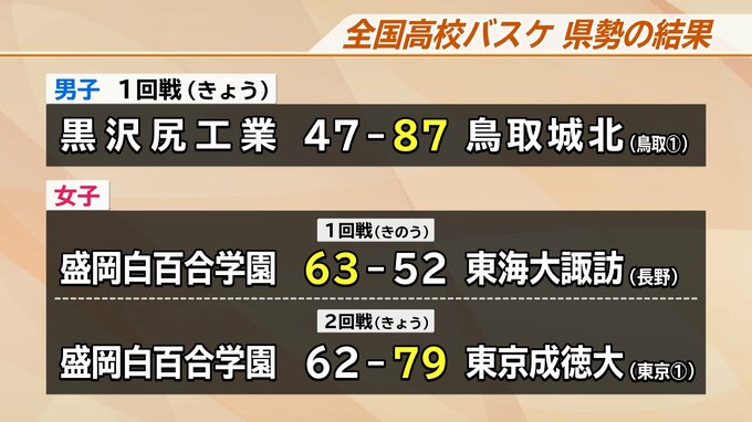 東京で行われている全国高校バスケットボール選手権大会=ウインターカップの県勢の結果です。24日初戦に臨んだ男子の黒沢尻工業は鳥取第1代表の鳥取城北と対戦し、87対47で敗れました。一方、女子の盛岡白百合学…