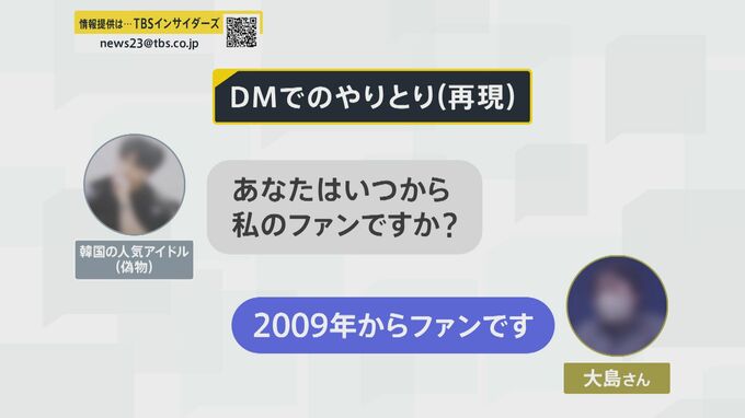 15年前から韓国のある人気アイドルのファンだったという大島さん。その人気アイドル本人を名乗る人物から2023年7月、SNSにダイレクトメッセージが届きました。