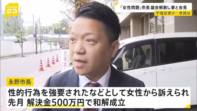 永野市長をめぐっては、性的行為を強要されたなどとして女性から訴えを起こされていましたが、11月、解決金500万円を支払うことなどで和解が成立。