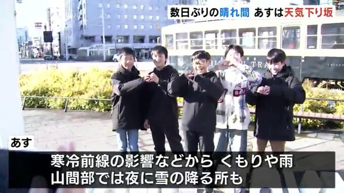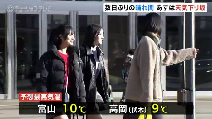 このあとは寒気や上空の気圧の谷の影響を受け夕方から曇りとなる見込みで最高気温は、富山で10℃、高岡市伏木で9℃の予想です。