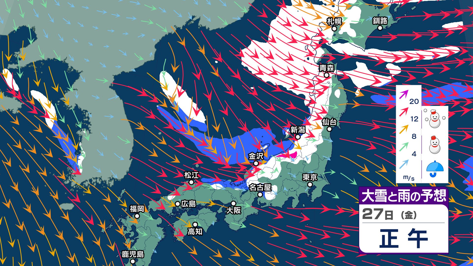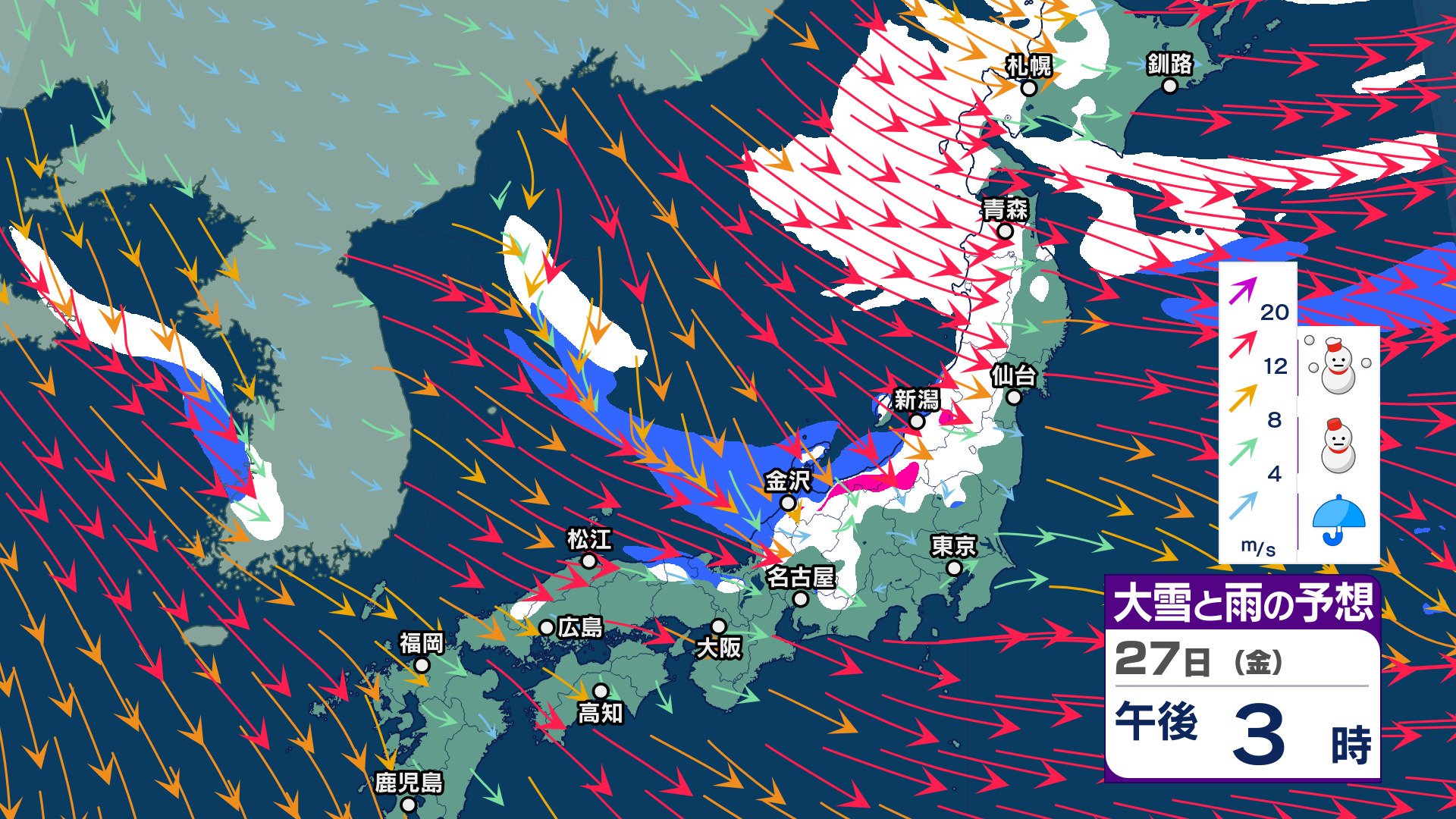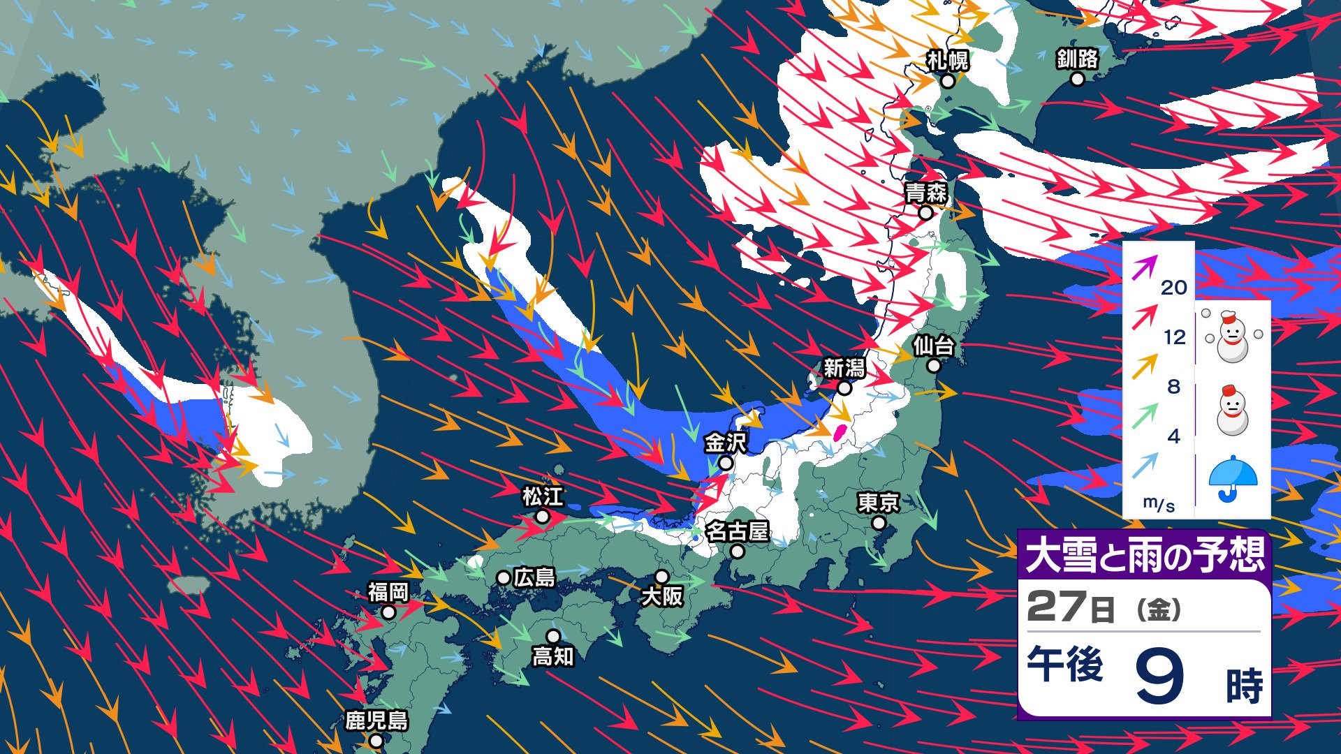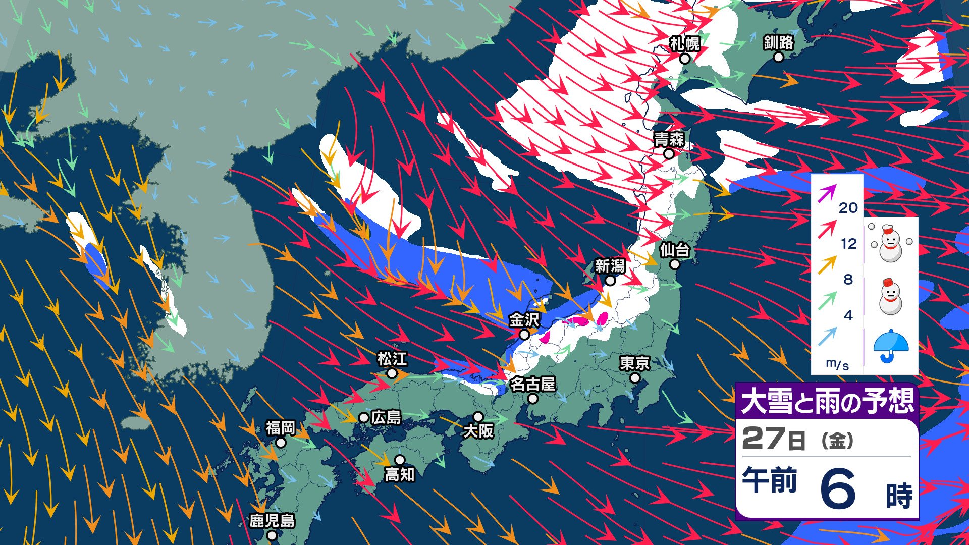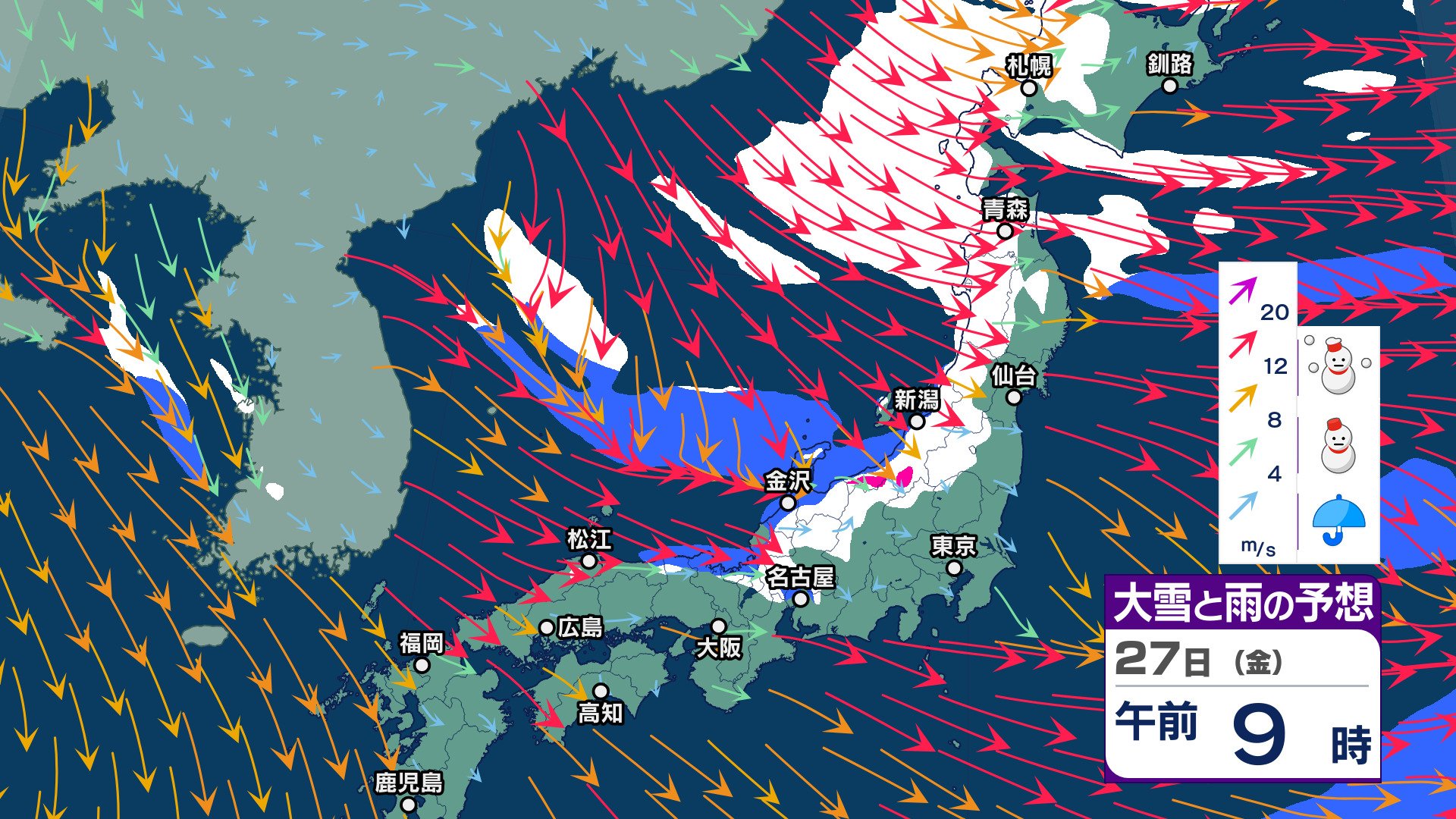 27日から28日、1月2日から3日は強い冬型の気圧配置へ 日本海側中心に大雪のおそれ【2週間天気】年末年始の帰省ラッシュやUターンラッシュに影響出る可能性【 雪と雨の動き シミュレーション】 チューリップテレビ 2024年12月25日(水) 15:23 国内 天気 大雪と雨のシミュレーション 27日(金)
