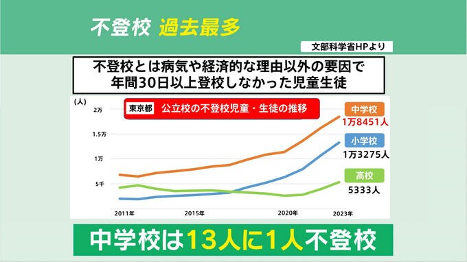 文部科学省HPによると東京都内の公立校の不登校児童・生徒の数は増加傾向にあり、2023のデータでは、