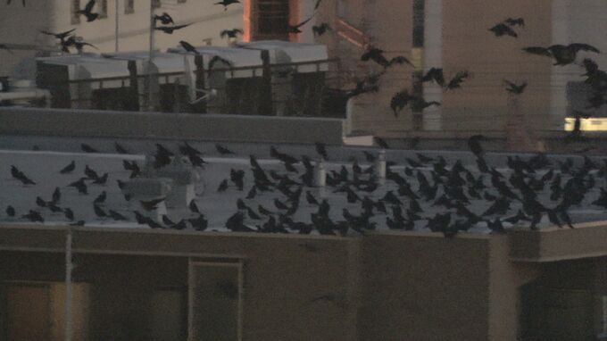 「一斉にカラスが飛び立って、ビルとビルの間を行ったり来たりしています」