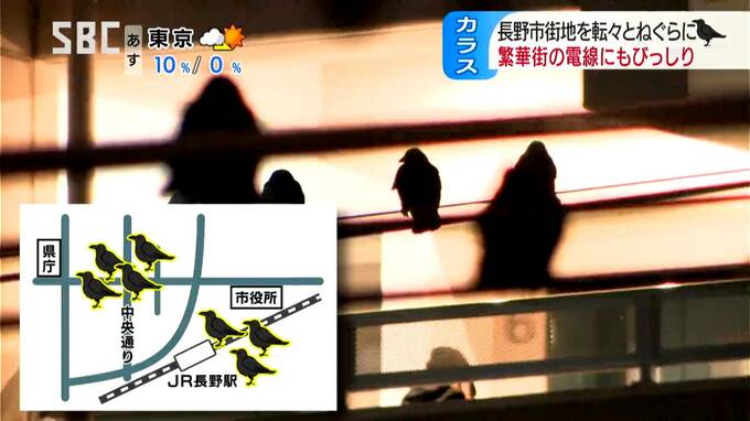 例年、秋から冬にかけて長野駅などで夜を過ごす様子がみられるカラスですが、今年は、12月に入って権堂や中央通り近くでも見かけるようになりました。