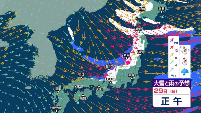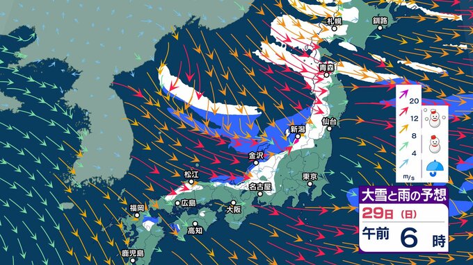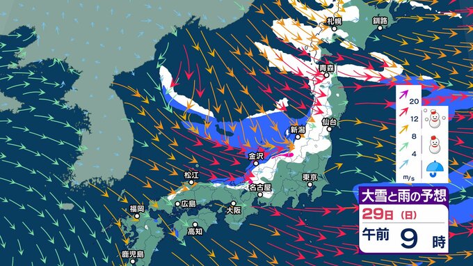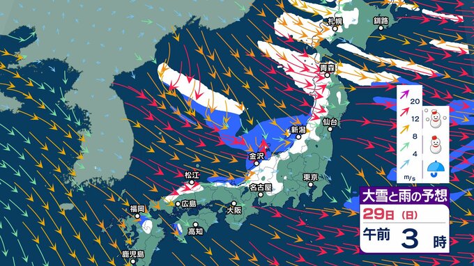 あす26日夜から再び強い寒波 週末にかけて日本海側の広い範囲で雪の見込みドカ雪になる恐れ…帰省に影響の可能性高く 道路の気象影響予測【 雪と雨の動き 3時間ごとシミュレーション】 チューリップテレビ 2024年12月25日(水) 18:22 国内 天気 大雪と雨のシミュレーション 29日(日)