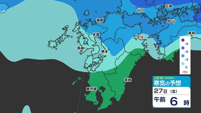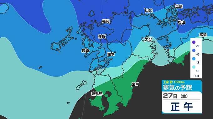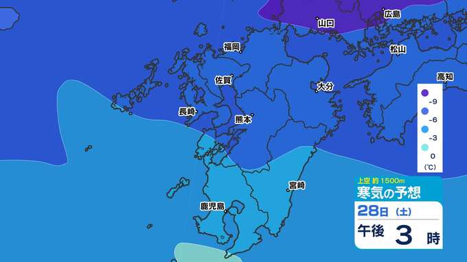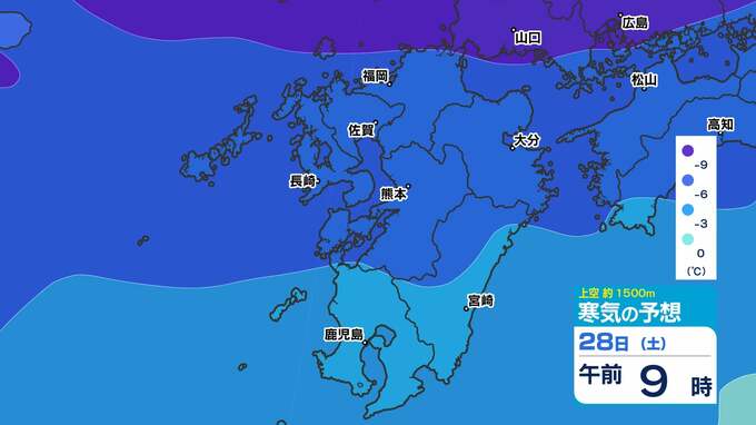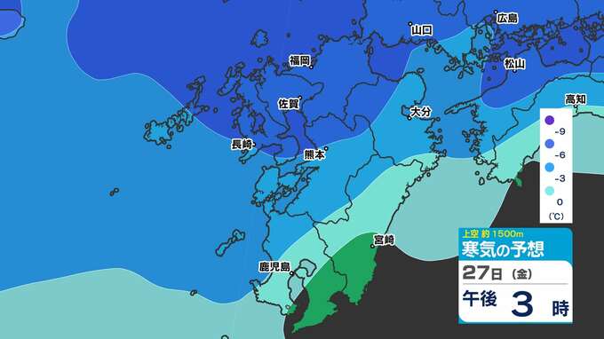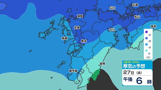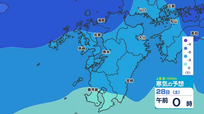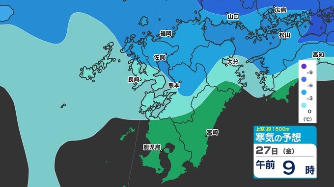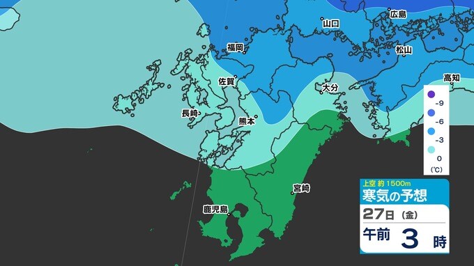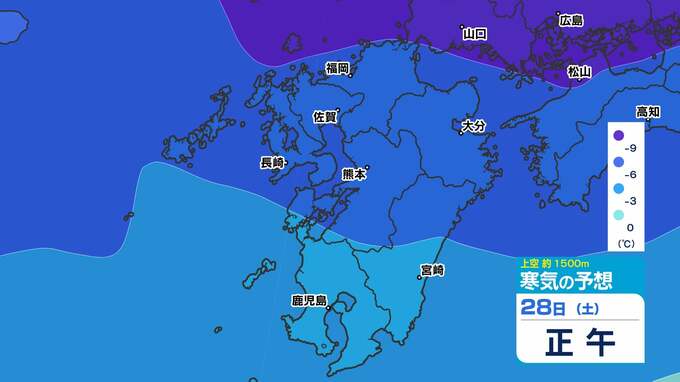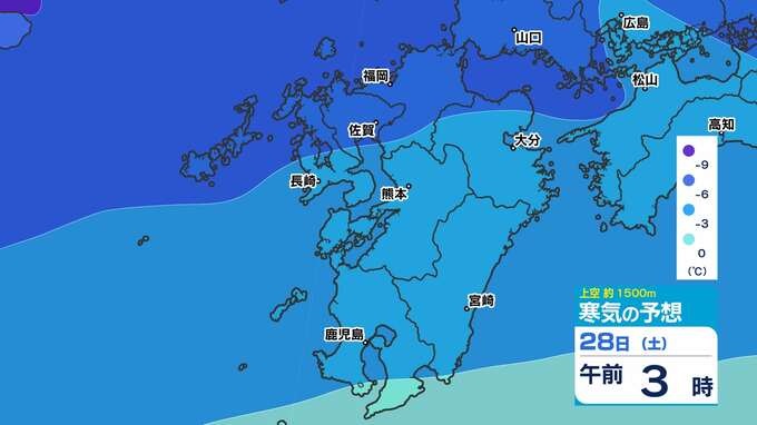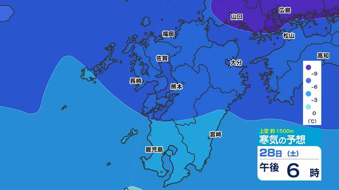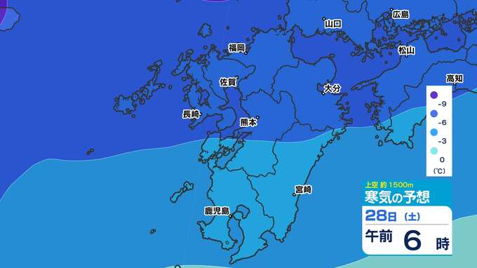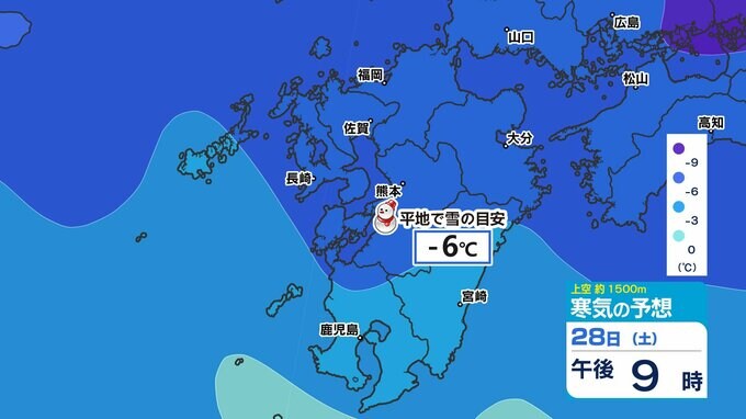 【1月1日元日】までの天気予報 今年最後の週末は厳しい寒さ 【福岡・佐賀・長崎・大分・熊本・鹿児島】雨と雪のシミュレーション/初日の出情報 南日本放送 2024年12月25日(水) 18:00 国内 天気 寒気のシミュレーション27日(金)~28日(土) 上空約1500mの寒気の予想です。 この高さでは「0℃が山地で雪」「‐6℃が平地で雪」の目安となっています。 寒気がどんどん南下し「平地で雪の目安‐6℃」が28日(土)九州北部をすっぽり覆うでしょう。