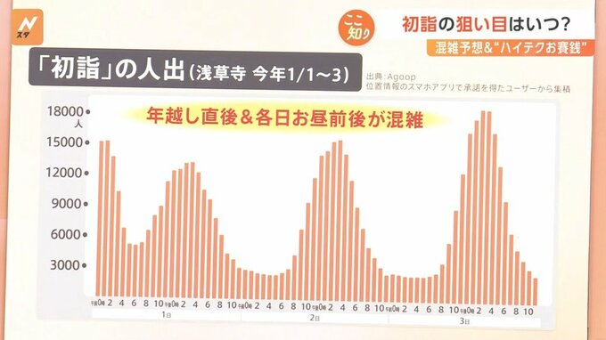 浅草寺の初詣(2024年1月1日~3日)の人出を、位置情報のスマホアプリで承諾を得たユーザーから集積したデータがあります(出典:Agoop)。やはり年越し直後と、各日お昼前後が混雑したとのことで、これは想像できるのではないでしょうか。