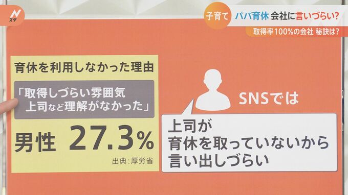 また、育休を利用しなかった理由としてもう一つ挙げられるのが、取得しづらいという雰囲気というところです。上司などの理解がなかったという声が男性で言うと27.3%、「上司が育休を取っていないから言い出しづらい」というようなSNSの声もありました。