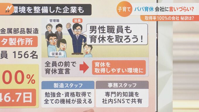 そもそものきっかけは、総務部に育休を取りたいんだけど、取りづらい空気があるんだよねっていう相談があったそうです。それを社長がたまたま耳にしたことで、これやっていこうよというふうに考えて動き出したそうなんです。