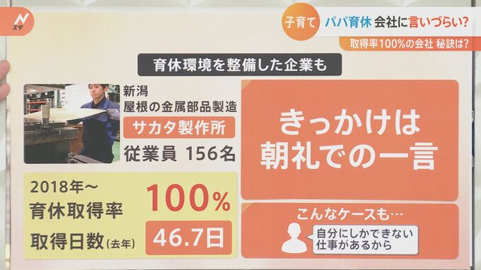 新潟の屋根の金属部品製造「サカタ製作所」です。従業員156人の会社なんですが、2018年から育休取得率がなんと100%。さらに2021年の取得日数が46.7日。始めた頃は大体18日ぐらいだったので、取得率だけではなくて日数も増えているという状況があります。