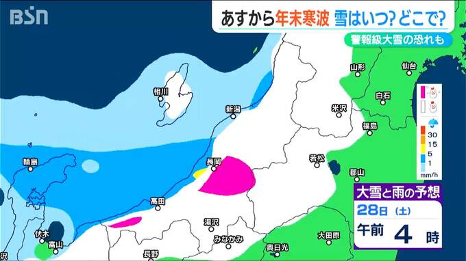 午後になると下越や佐渡では一時的に雪は止みますが、28日には再び雪となり寒気が予想より強まった場合は中・上越の山沿いで警報級の大雪となる恐れがあるということです。